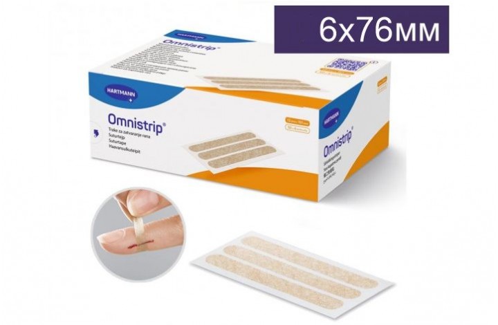 OMNISTRIP — гипоаллергенные стерильные хирургические полоски для закрытия послеоперационных швов, доступные в размере 12 мм х 101 мм в упаковке по 300 штук от производителя HARTMANN.